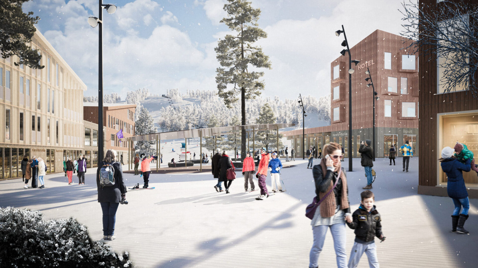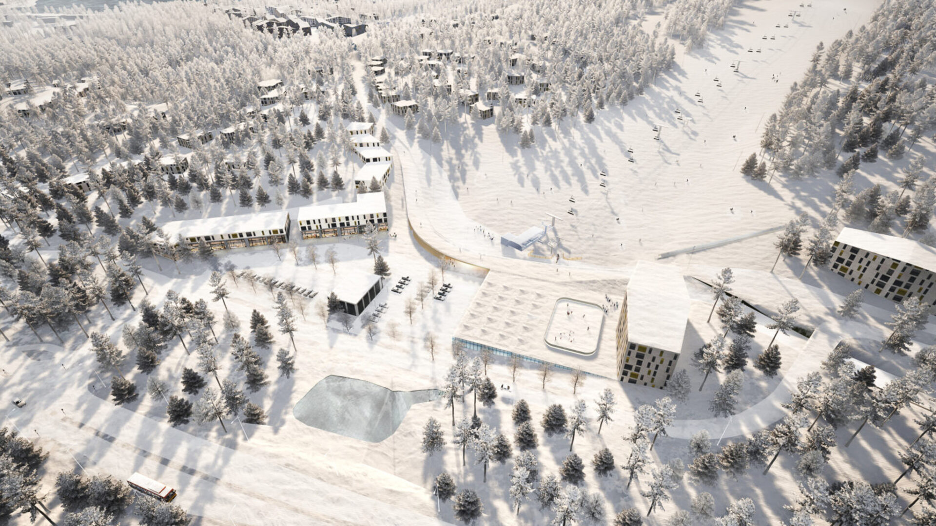 - Kyläkeskus: Pohjoisen rinnealueen viereen rakennetaan tiivis, ”monoilla käveltävä” kyläkeskus. Suunnitelmaan sisältyy uusi hotelli ja julkinen sauna.