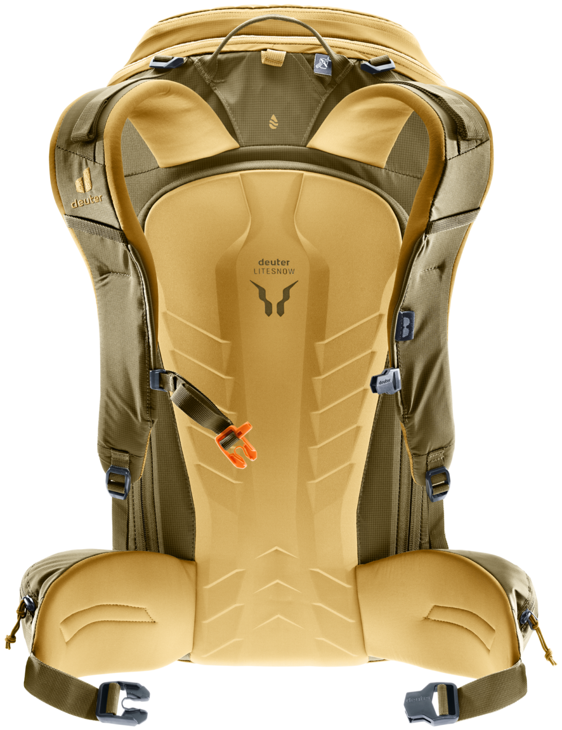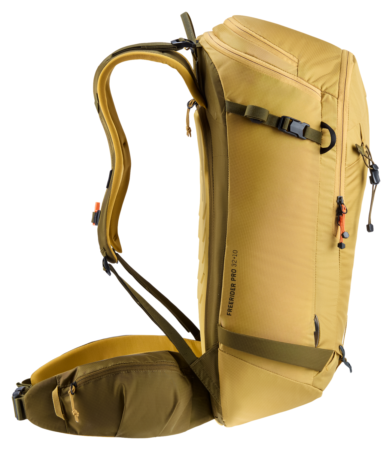 Pidin Freerider 32+10:n taskujen ja osastojen asettelusta. Selkäpaneeli aukeaa kokonaan, mikä edesauttaa sitä, että tavaroita on helppo ottaa esille ja laittaa takaisin lumisessa maastossa. Kun repun voi heittää lumeen ulkopuoli edellä, ei yksittäisiä tavaroita tarvitse kaivella vaivalloisesti repun pohjalta. Tämä auttaa myös repun pakkaamisessa. Reppuun pääsee sisälle myös perinteisesti yläkautta. Samaisessa yläsisäänviennissä on rullattava lisäosa, joka antaa repulle 10 litraa lisää tilavuutta.