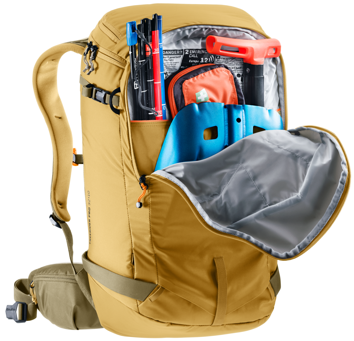 Vyöryvarusteiden tasku on hyvin suunniteltu ja riittävän kokoinen – se on erotettu päälokerosta. Lokeron vetoketjujen päät on merkitty kirkkaammilla nauhoilla, joiden oletettava tarkoitus on auttaa löytämään vetoketju stressitilanteessa. Sisälle on painettu toimintaohjeet hätätilanteeseen, jos ne paniikissa unohtuvat. Ehkä tästä on apua jollekin. Muuten vyörytasku on hyvin simppeli ja ajaa asiansa erittäin hyvin. Sisälle saa aseteltua kivuttomasti lapion varren, lapio-osan, sondin ja vaikka ensiapupakkauksen.