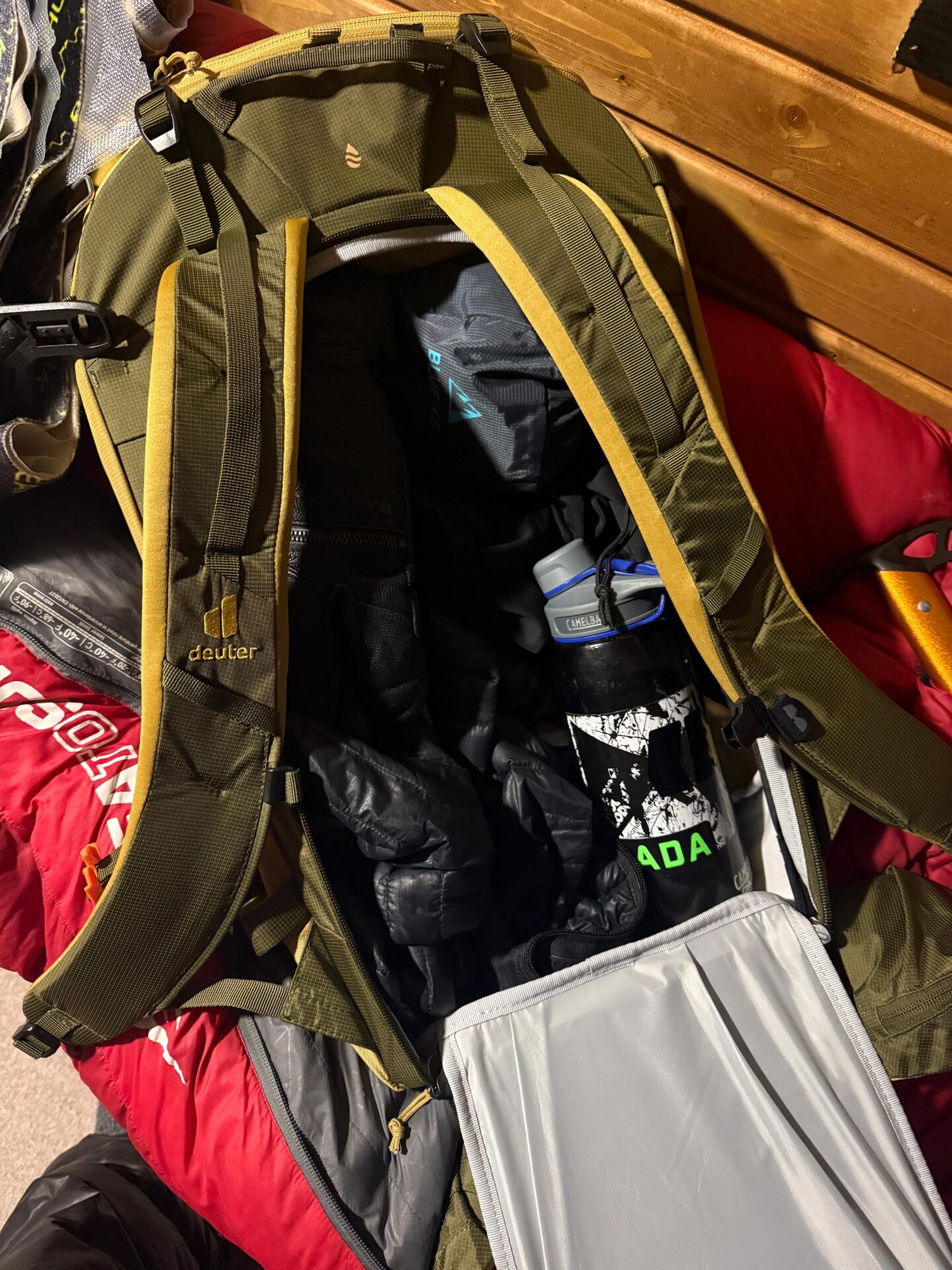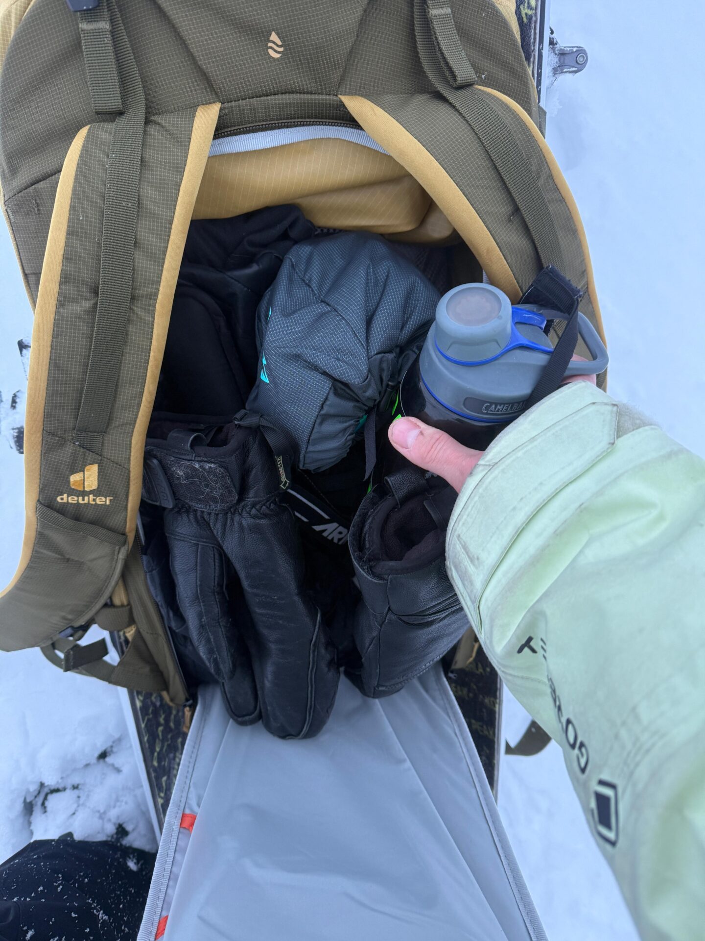 Repussa tulee siis olla riittävästi tilaa päivän nesteytykselle, taukotakille, varahanskoille, kypärälle, skinnailuvarusteille sekä nousuraudoille ja nousupleiteille. Mukaan lähtee myös jotain syötävää – ei mitään kuuden ruokalajin illallista, vaan nopeasti käytettävää energiaa: patukoita, geelejä, leipää ja juustoa. Välttämättä en pakkaa matkaan varalaseja mutta yksille laskulaseille pitää löytyä tilaa.