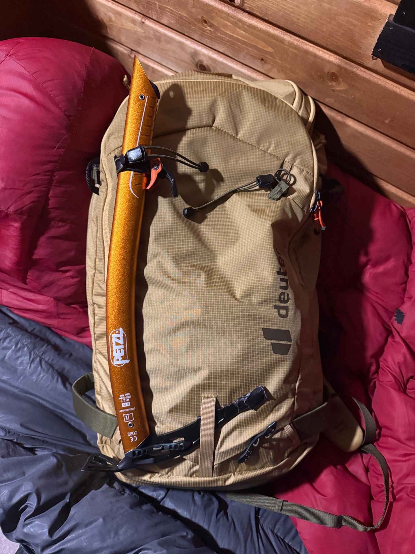 Lantiovyöstä löytyy molemmilta puolilta taskut, jonne saa sujautettua vaikka lisäenergiaa, kypäräkameran tai jotain muuta vastaavaa. Lyngenissä harvemmin kannan mukanani hakkua, mutta sillekin repussa on oma paikkansa. Deuterin Freerideriin saa itse asiassa kaksi hakkua kiinni erittäin näppärällä kiinnitysmekanismilla.